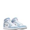 White/blue leather/rubber Air Jordan 1 High OG sneakers from Jordan Kids featuring signature Air Jordan Wings logo, signature Swoosh logo detail, contrasting panel detail, round toe, front lace-up fastening, logo patch at the tongue, ankle-length, branded insole and rubber sole. These styles are supplied by a premium sneaker marketplace. Stocking only the most sought-after footwear, they source and curate some of the most hard to find sneakers from around the world..