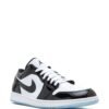The Air Jordan 1 Low SE “Concord” sneakers are crafted from a white leather base enhanced by black patent leather inserts. This model features a low-top silhouette with multiple branded motifs – like the Swoosh logo on the sides, the Jumpman logo on the tongue and an embroidered Wings insignia at the heel.